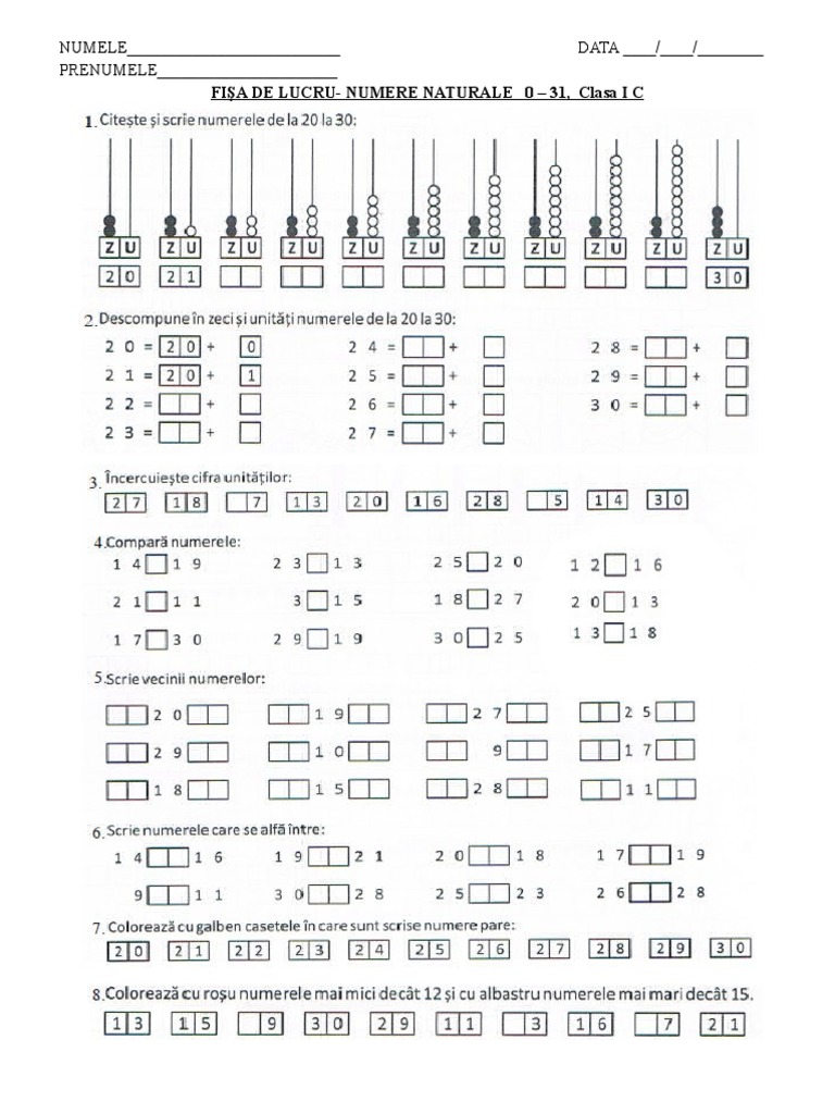 Numerele Naturale De La 0 La 31 Fișă De Lucru Pentru Consolidare