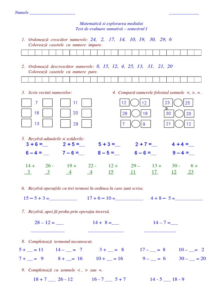 Evaluare Sumativă Mem Clasa I Semestrul I