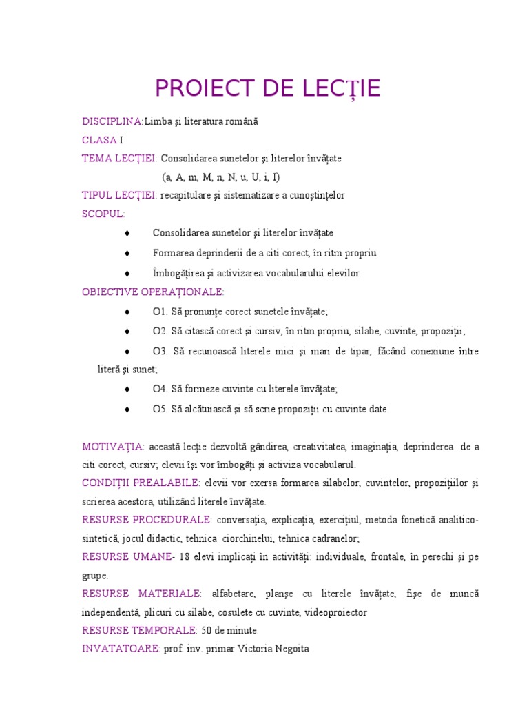 Fisa De Citit Clasa Pregatitoare Literele A M U N I
