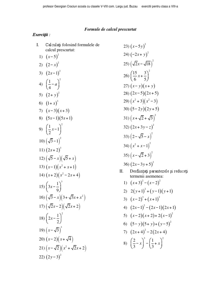 Formule De Calcul Prescurtat Ii Exercitii Rezolvate Matematica