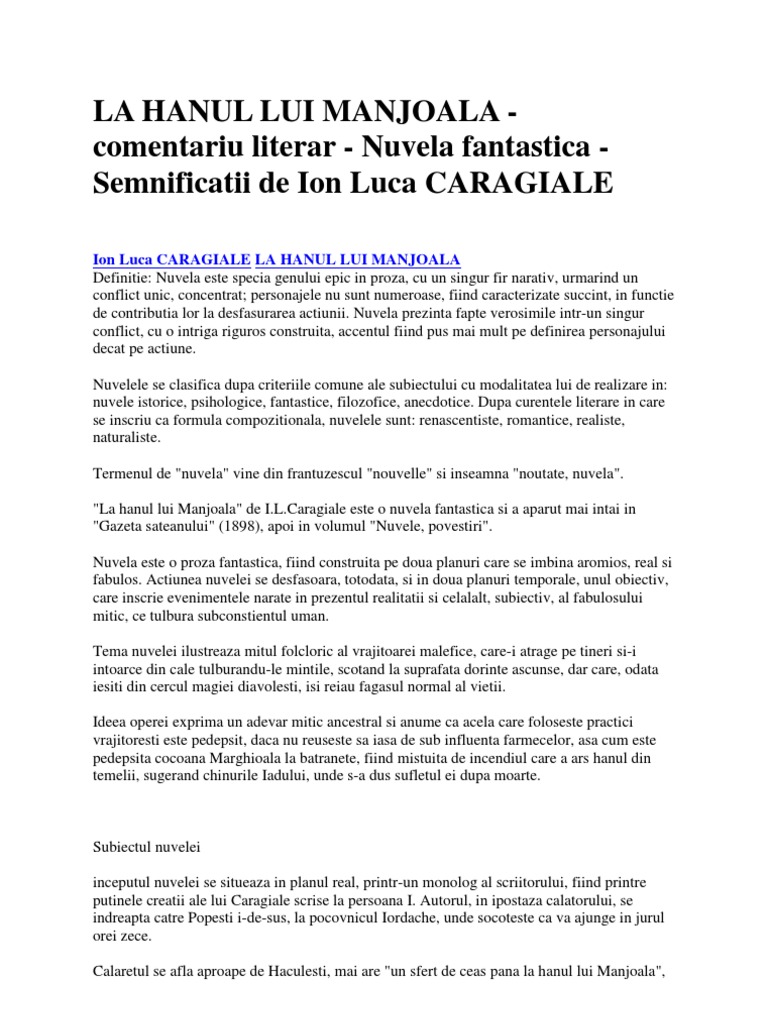 Scribd is the world s largest social reading and publishing site. La hanul lui mânjoală este o nuvelă scrisă de ion luca caragiale această nuvelă are particularități care o fac unică în contextul literaturii naționale dar și universale. De acolea până n popeștii de sus o poștie. Arsese până în pământ hanul lui mânjoală îngropând.