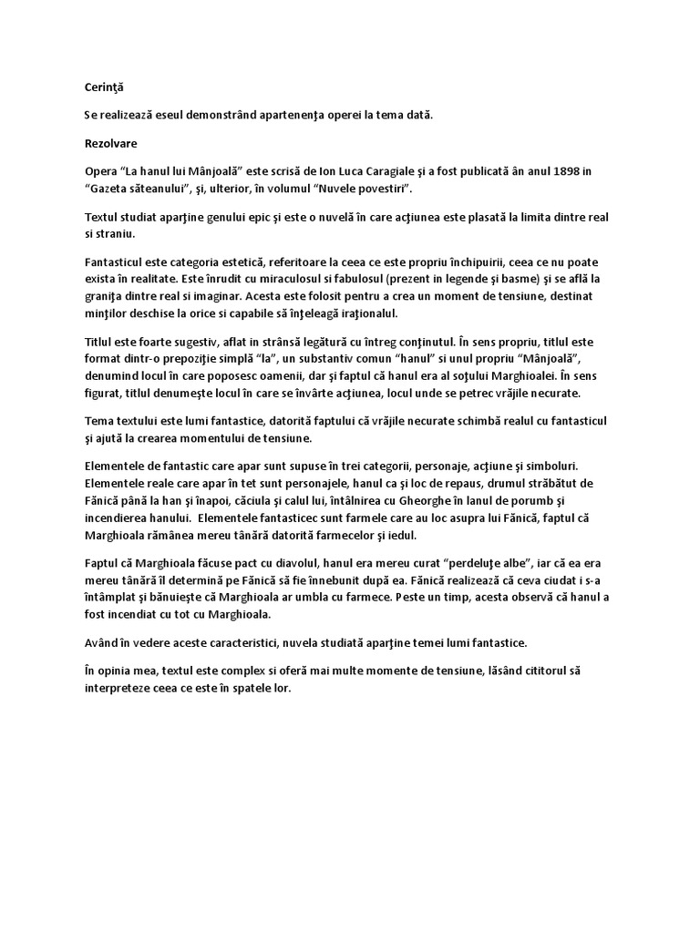 La hanul lui mânjoală 1 la hanul lui mânjoală la hanul lui mânjoală de ion luca caragiale apărut în 1898 un sfert de ceas până la hanul lui mânjoală. Comic tragic și fantastic. Apartenenta la tema lumi fantastice ipoteza opera la hanul lui manjoala este scrisa de ion luca caragiale si a fost publicata in anul 1898 in gazeta sateanului si ulterior in volumul nuvele povestiri. La hanul lui manjoala elementele fantasticului din a doua secventa secventa in care personajul narator rataceste in inercarea de a ajunge la popesti pentru a se logodi cu fata cea mare a pacovnicul iordache este presarata cu nenumarate elemente care aduc la planul fantasticului un plan in care personajul este prins fara voia lui.
