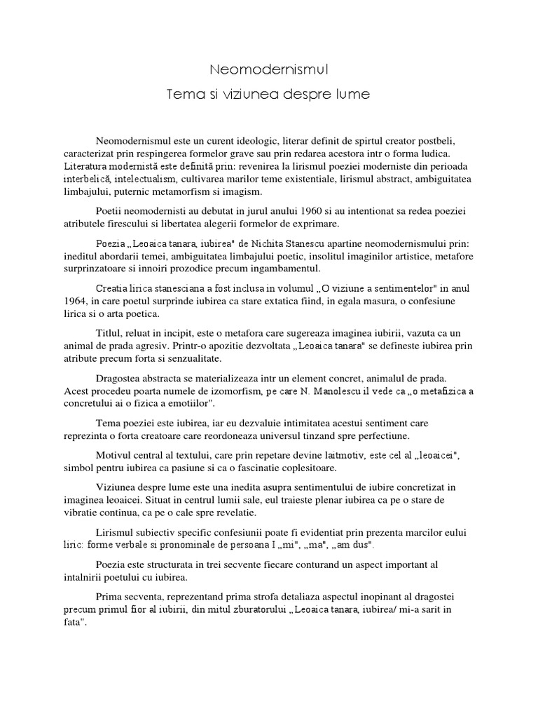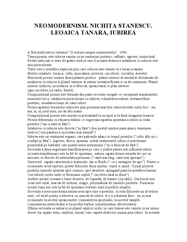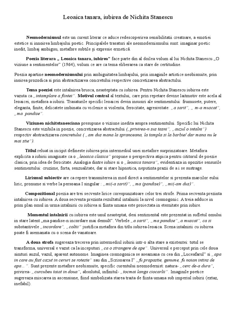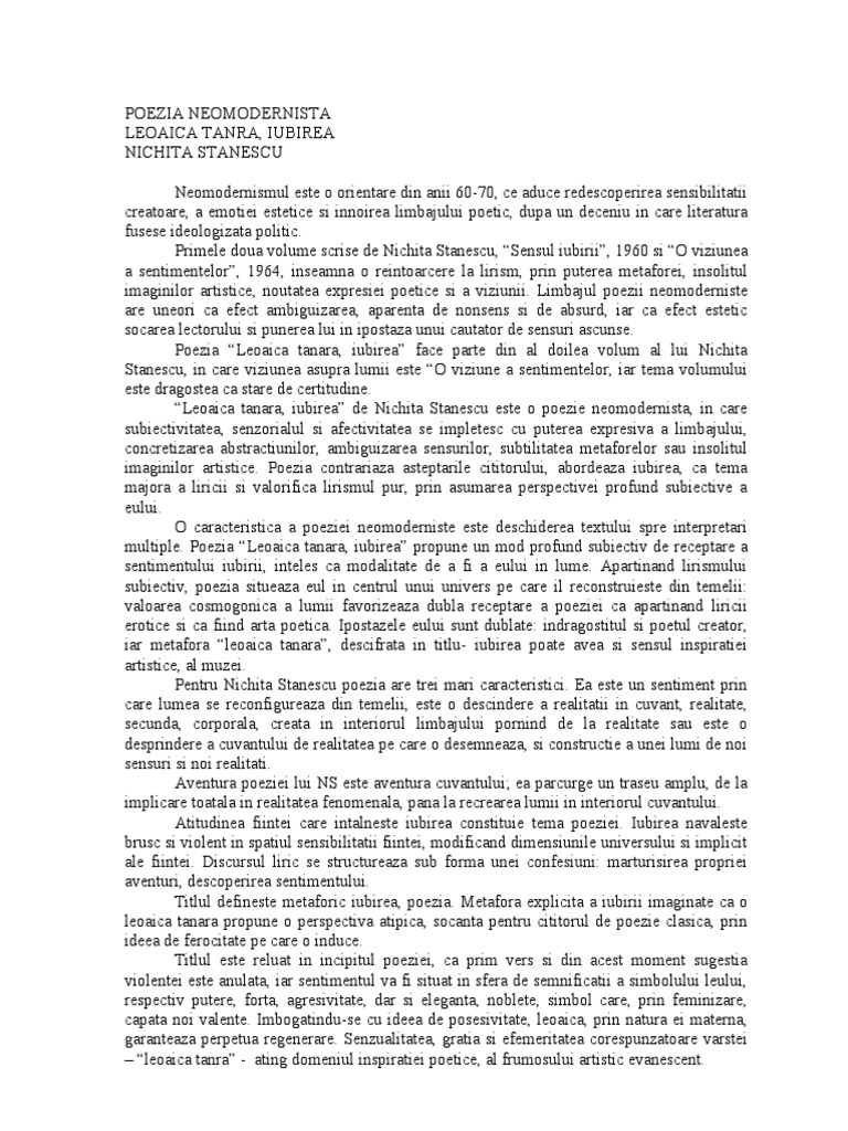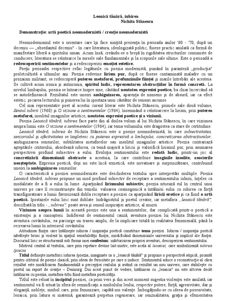 Comentarii Eseuri Bacalaureat Poezia Neomodernistă Leoaică