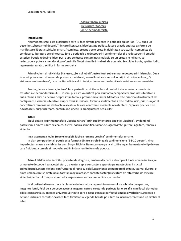 Leoaica Tanara Iubirea De Nichita Stanescu