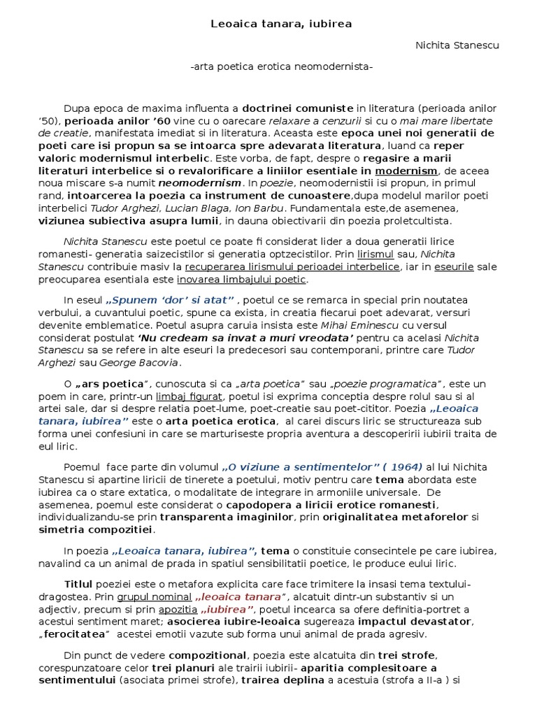 Nichita Stanescu Leoaica Tanara Iubirea Neomodernism