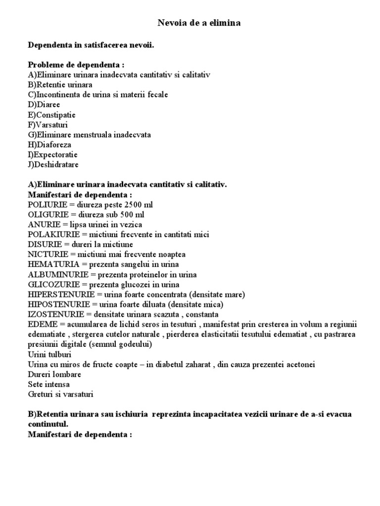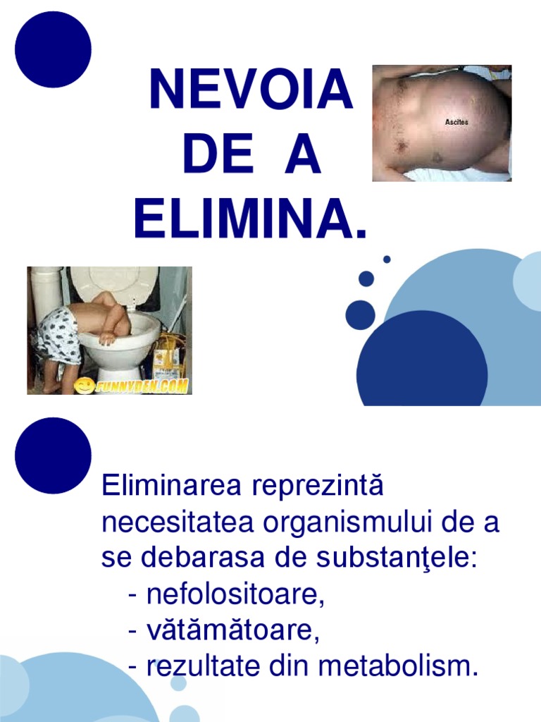 Nevoia de a elimina. Nevoia de a elimina eliminarea reprezinta proprietatea organismului de a se degaja de substantele inutile precum si de alte substante de dezasimilatie nefolositoare. Fisierele documentului original au urmatoarele extensii. Aparat renal urina. Nevoia de a elimina eliminarea reprezintă necesitatea organismului de a se debarasa de substanţele nefolositoare toxice rezultate din metabolism.