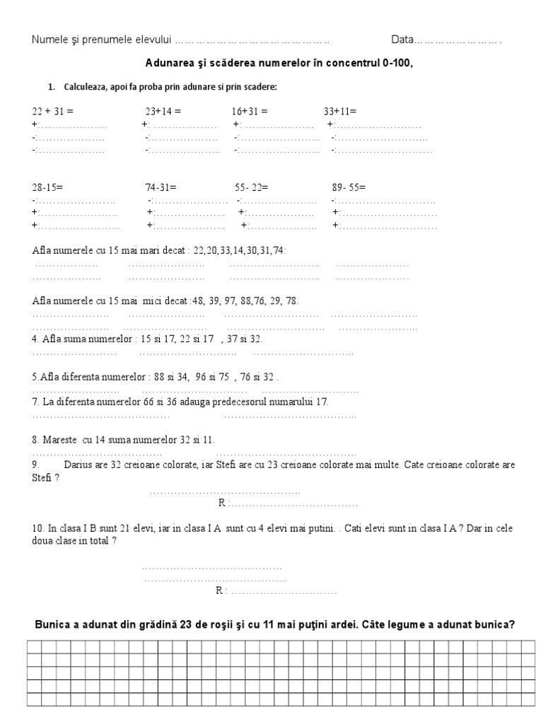 Test Matematica Adunari Si Scaderi In Concentrul 0 100 Fara Trecere Peste Ordin
