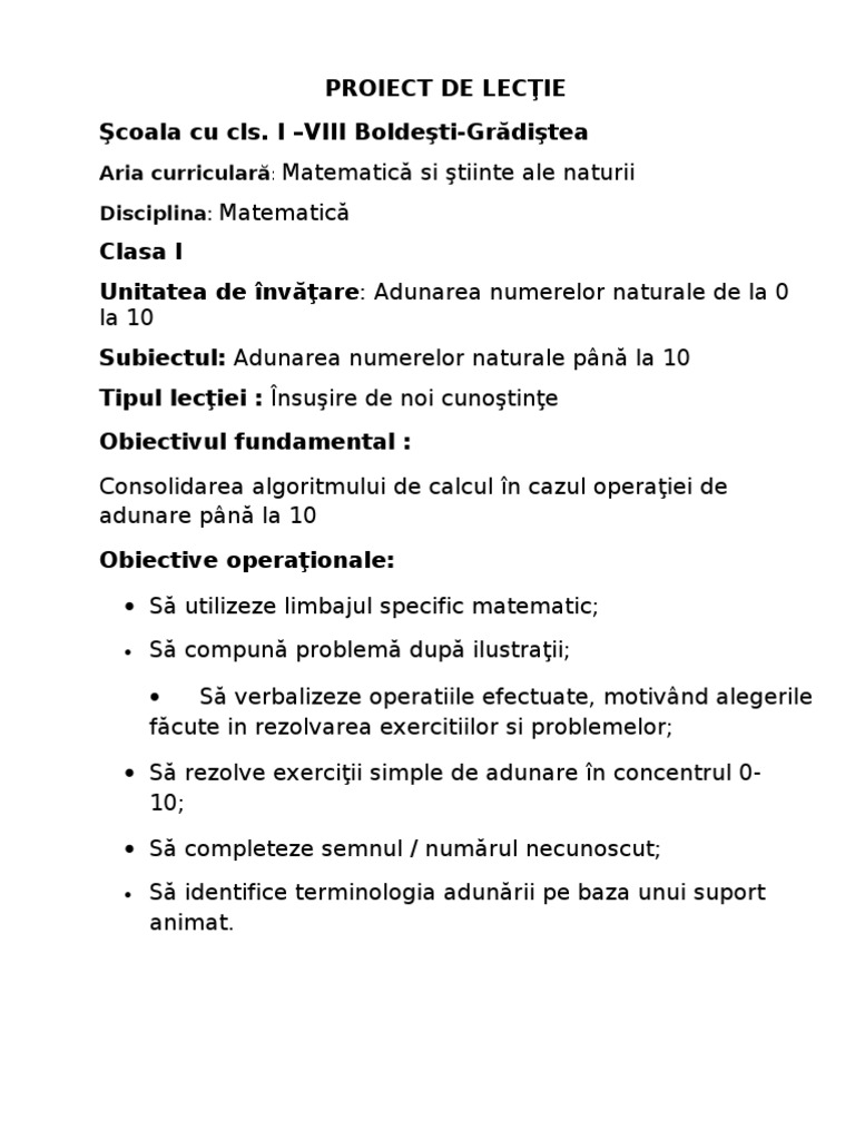 Proiect Proiect De Lectie Matematica Si Stiinte Ale Naturii