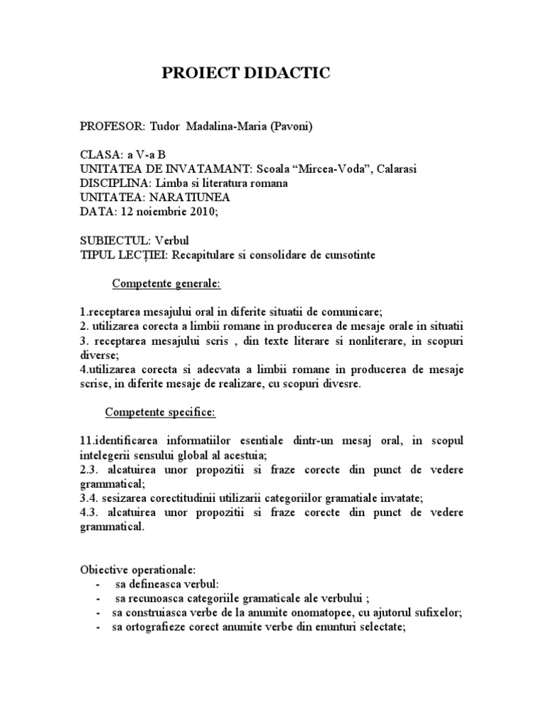 Proiect Didactic Verbul Pedagogie Pedagogie Uoradea Studocu