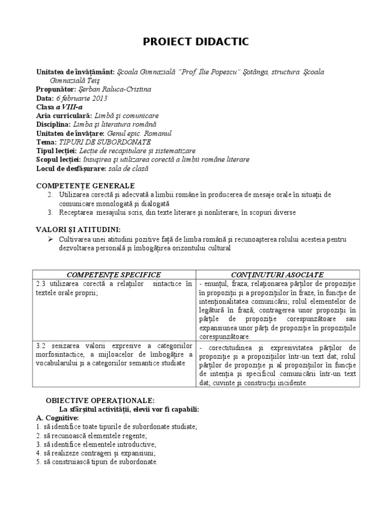 Proiect Didactic Tipuri De Subordonate Clasa A Viii A