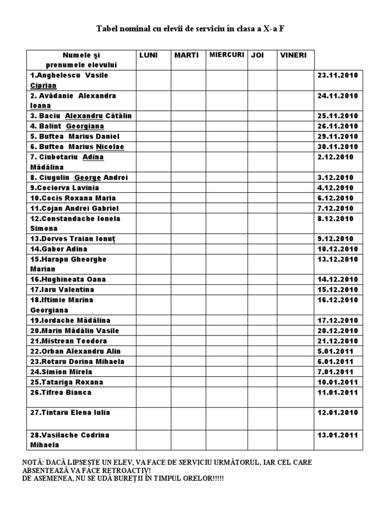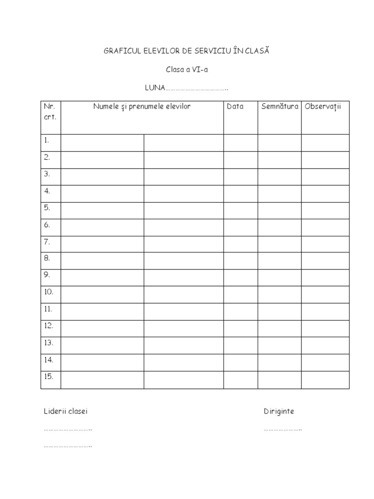 Tabel Elevi De Serviciu Pe Clasa