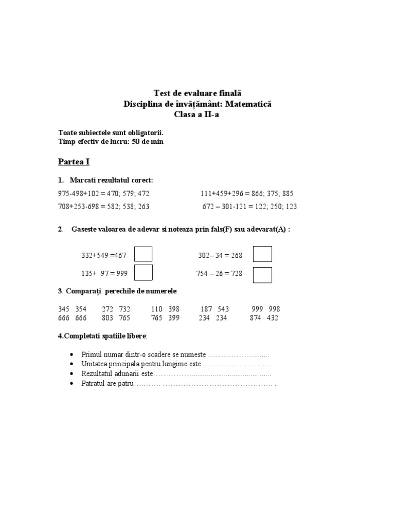 Fise De Lucru Scolari I Iv Test La Matematica Clasa A Iv A