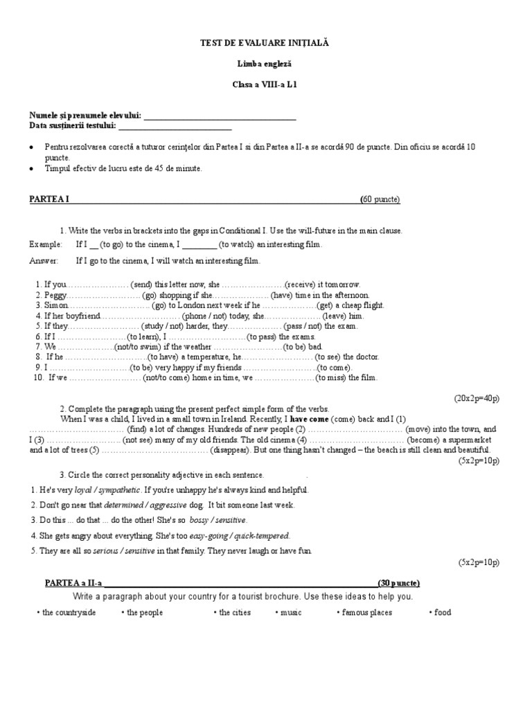 Test Initial Clasa A 9 A L1 Engleza 45 Min Barem